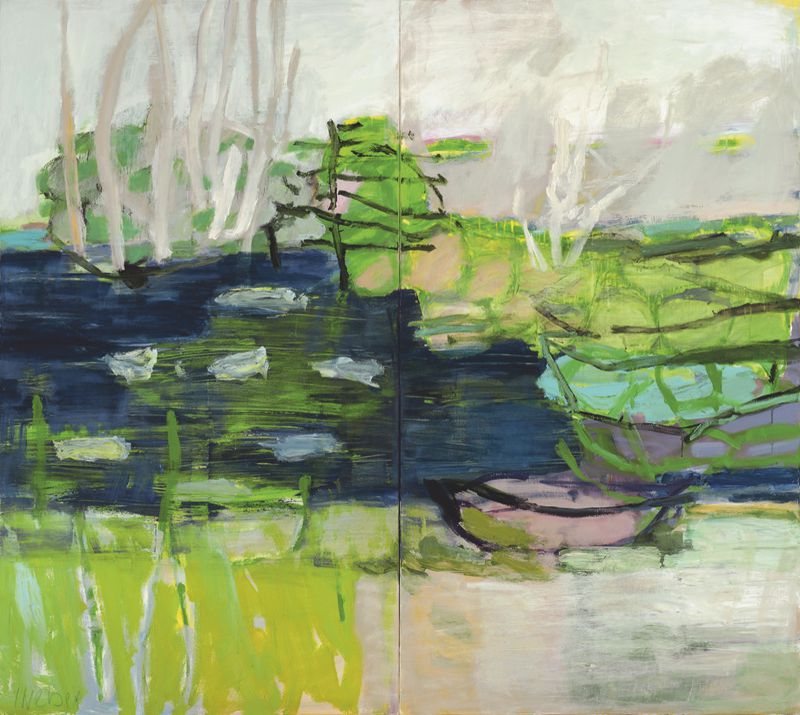 Rational Gebautes wie spontane, malerische Geste verdichten sich spannungsvoll in ihren Kompositionen, Figürliches und Abstraktes überlagern und durchdringen sich. Durch die alles verbindende Kraft der Farbe, das Farbenmeer von Grün/Blau und hellem Gelb gelingt es Irmgard Weber, eine lebendige, kontrastreiche Einheit zu schaffen. Vieles bleibt in der Schwebe zwischen Realität und Imagination und macht das Geheimnis ihrer Bilder aus."
